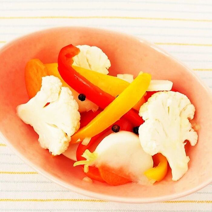 野菜そのものの味を活かした洋風浅漬けは、お酢の酸味と玉ねぎの香り、七彩べじぶろすの旨味が合わさり奥深い味わいに。お酢には、疲労回復効果や血圧の上昇を抑える作用があります。さらに野菜と合わせることで、糖の吸収をゆるやかする効果も。血圧や血糖値が気になる方にはおすすめの料理です。新生活が始まりストレスがかかりやすい時期に、お酢を使った料理を食べて元気に過ごしましょう。