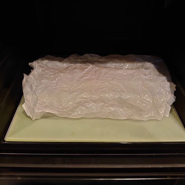 レンジに入れて、上からくしゃくしゃシートをふわっと乗せて