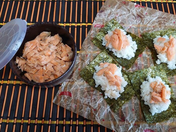 おにぎりにすると、握る分白米を多く摂取しそうなので、我慢しておにぎり海苔2枚分を半分にカットして、量を少なく食べました😭