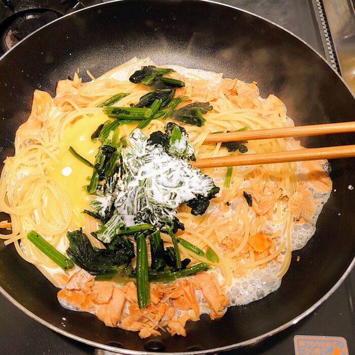最後にコーヒーミルクを入れよく混ぜて、最後に塩.コショウで味を調節して完成です🍝