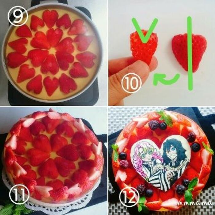 →いちご(飾り用)のヘタを切り落とし、縦1/4にカットしてヘタの方をV字にカットしてハートの形にします。(写真⑩参照)