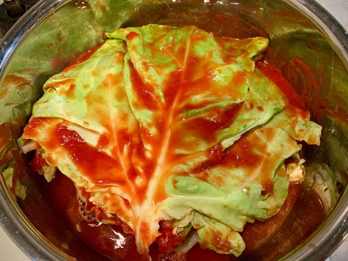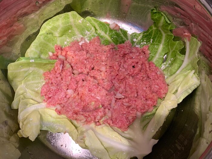キャベツをはがす。《底に敷く分と、表面にかぶせる分の2枚だけきれいにはがせば、あとはビリビリちぎってOK》