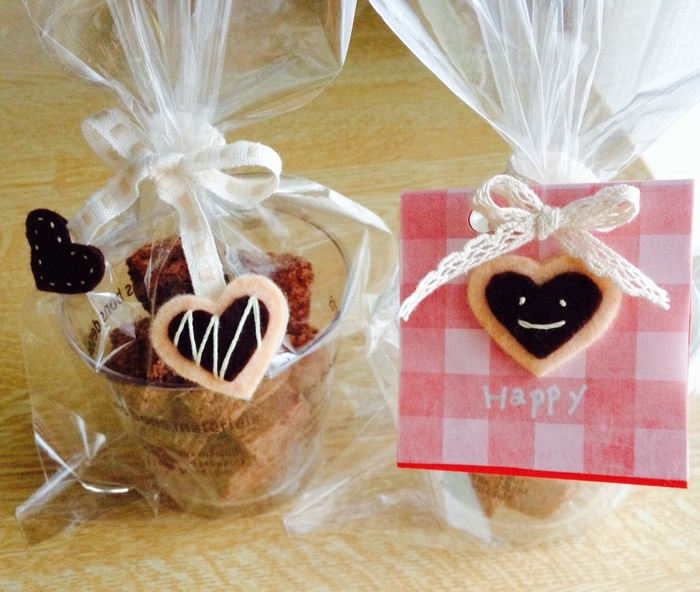 一つはリボンの先にハートのクッキーを付けて袋を結んでいます。リボンの端をフェルトで挟むようにしてボンドで止めています。小さな女の子がいるおうちなら、リボンは髪飾りやカバンなどに結んで使ってもらえるかなと思います。
