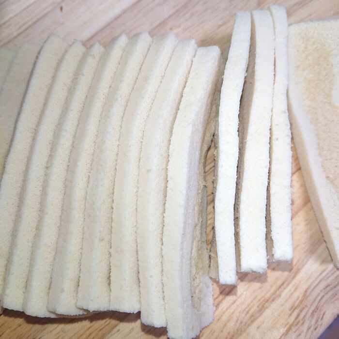 高野豆腐を包丁で切りやすくなるまで水につけて、3㎜幅に切る。