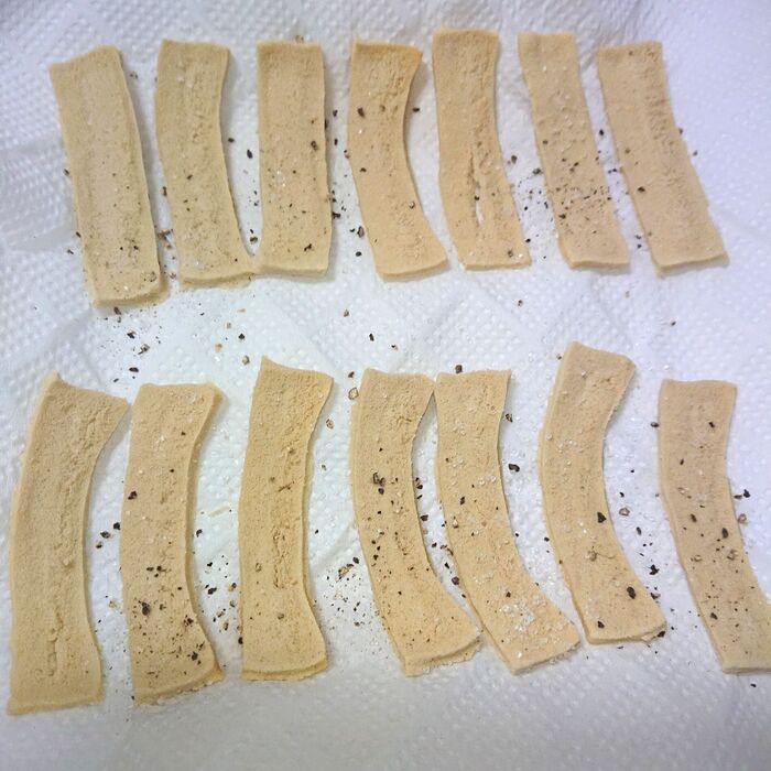 ペーパータオルで高野豆腐の水気を拭き取り、ペーパータオル2枚に並べのせて、塩をお好み量かける。