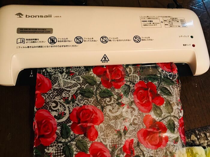 パッケージのビニールを、ラミネーターフィルムに挟みます。