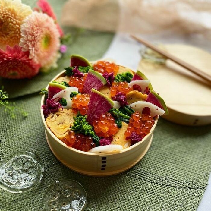 上には 卵焼き 菜の花 レンコン 紅芯大根 いくら 紫菊です。