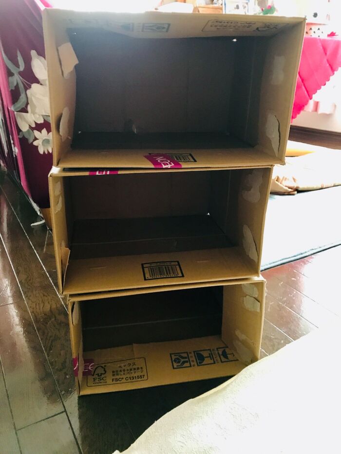 段ボールの口を開いてスプレーのりで貼ります。3段になるようにスプレー糊をつけて固定します。