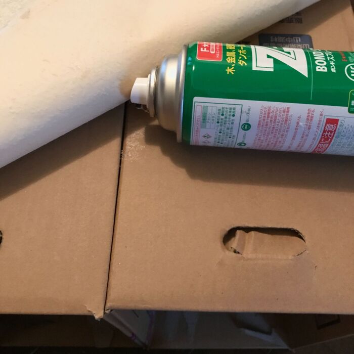 壁紙を周りと、内側の段ボールが2重になっているところにスプレー糊で貼ります。