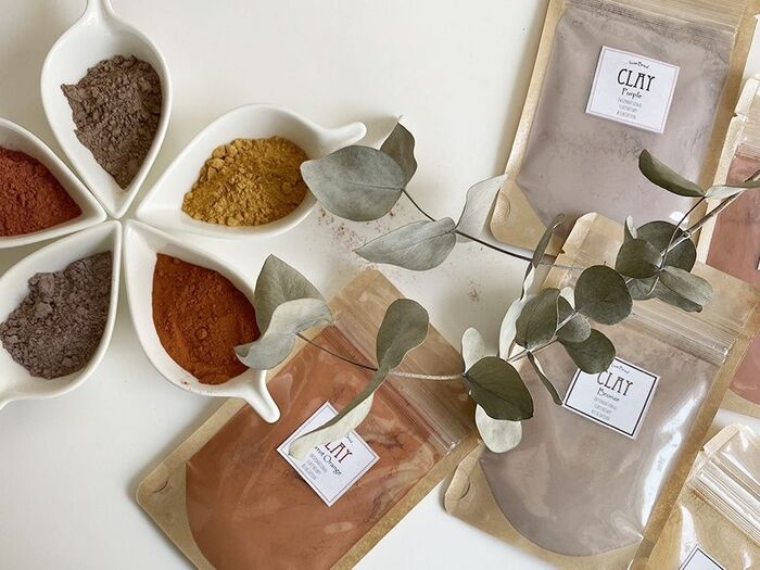 素肌に纏うクレイは、カオリナイトを主成分にしたホワイトクレイをベースにアレンジしていきます。それぞれの肌の色や肌質、目的にあわせてタイプの違うクレイをほんの少量ずつ組み合わせます。ふわふわとした優しい手触りのヒーリングクレイを、乳鉢のなかでゆっくりと混ぜ合わせていく作業は、子どものころの砂あそびにも似て不思議な懐かしさがあります。