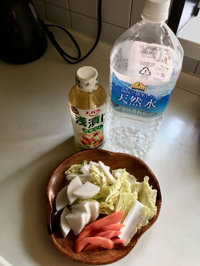 ①の野菜を入れ、浅漬けの素を野菜がかぶるくらい入れます