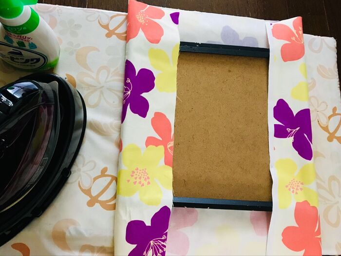 生地にアイロンをかけ、グルーガンで貼ります。