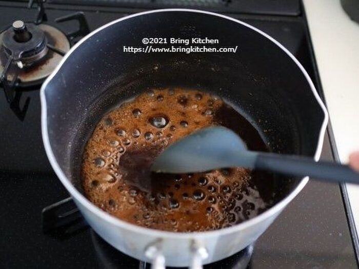 鍋にタカラ本みりんを入れて中火にかけ、の々字が書ける程度まで煮詰める。