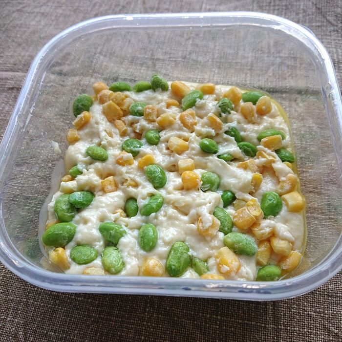 耐熱容器のタッパーに油を塗り、生地を入れ込み、冷凍コーンと冷凍枝豆を入れて、箸でかるく押し込む。