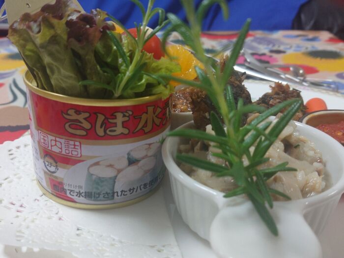 鯖缶にサニーレタスを敷き込みオレンジとゼスト、トマト、クリスピー鯖フレークを盛り付ける!!