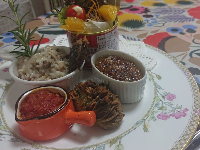 新玉ねぎとニンニク、マシュルームを炒め・・・・鯖の水煮の液体を加え、リゾットを炊き上げる。パルメザン、塩コショウで味を調える!! 鯖クリスピーとローズマリーをトッピング!!
