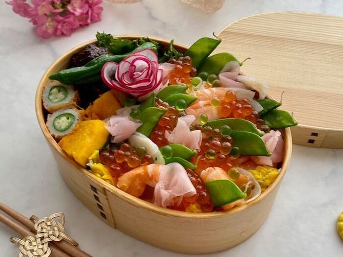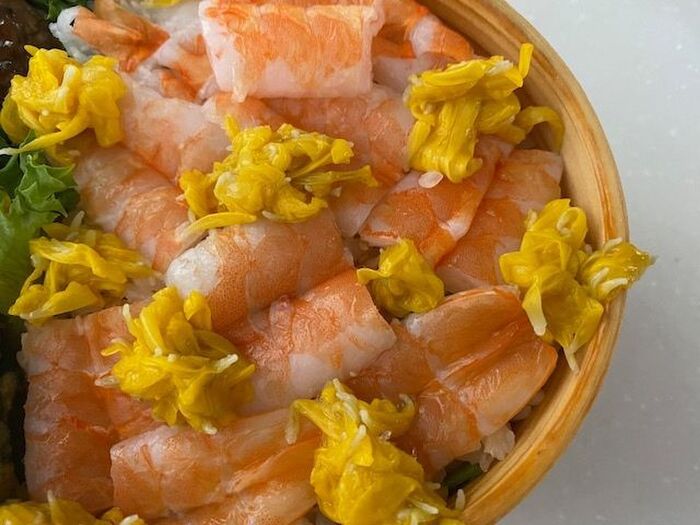 お弁当に詰め おかずを詰めたら ちらし寿司の上に 茹でエビと菊の甘酢漬けをのせる