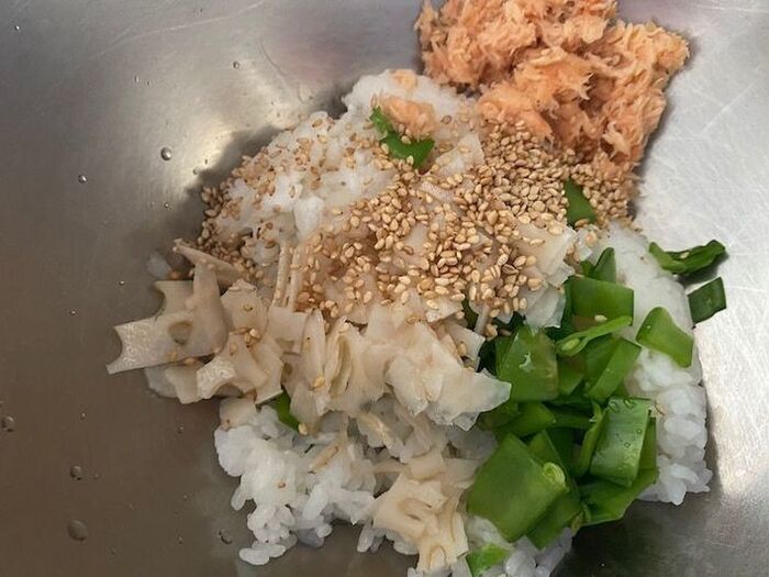 熱々のご飯に 寿司酢 鮭フレーク 刻んだれんこんマリネ 茹でて刻んだ福島県産さやえんどう 白ごまを加混ぜ合わせる