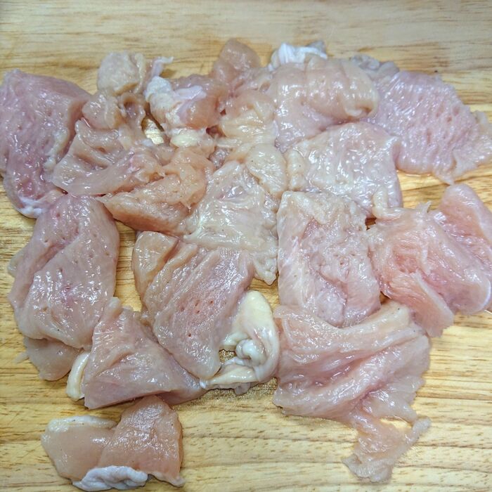 鶏胸肉は一口大に切り、フォークでたくさん刺して穴をあける。