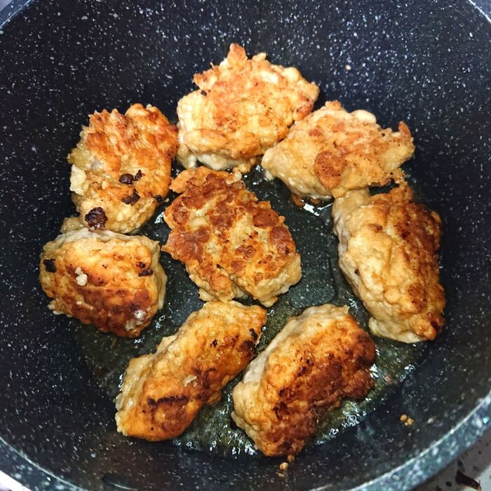 油を熱した小さなフライパンに鶏胸肉半分を入れて、両面こんがり焼く。