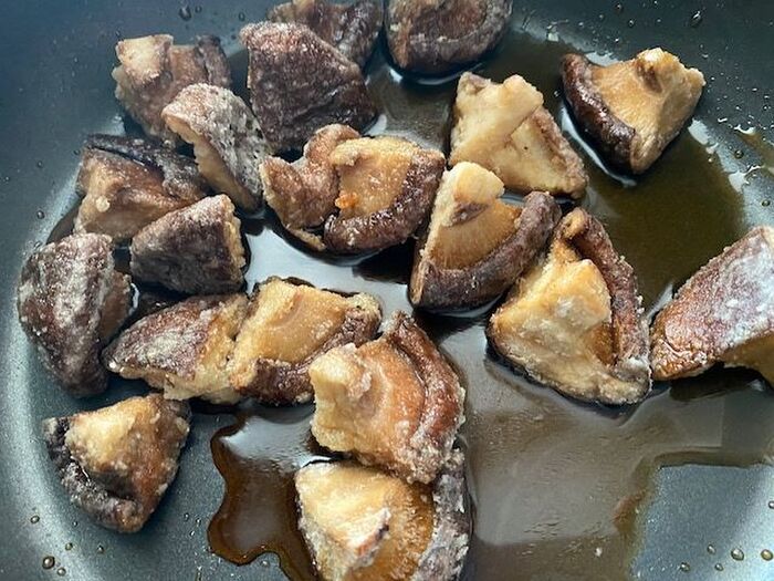 a(醤油・みりん・きび砂糖)を一煮立ちさせ揚げたしいたけを絡器に盛り付けお好みで一味唐辛子をふる
