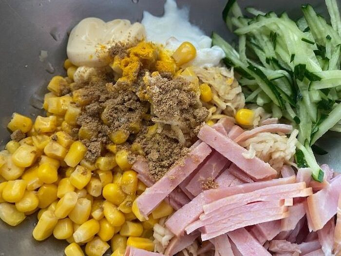 食べやすい大きさに切った切り干し大根と コーン缶 短冊切りにしたハム 千切りきゅうり マヨネーズ ヨーグルト クミン・カルダモン・ターメリックを加え 塩・コショウで味を調える