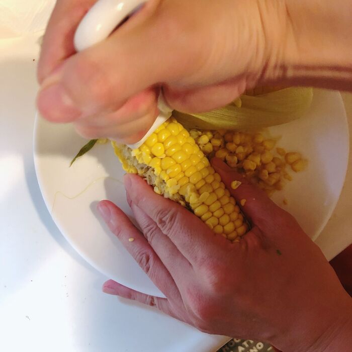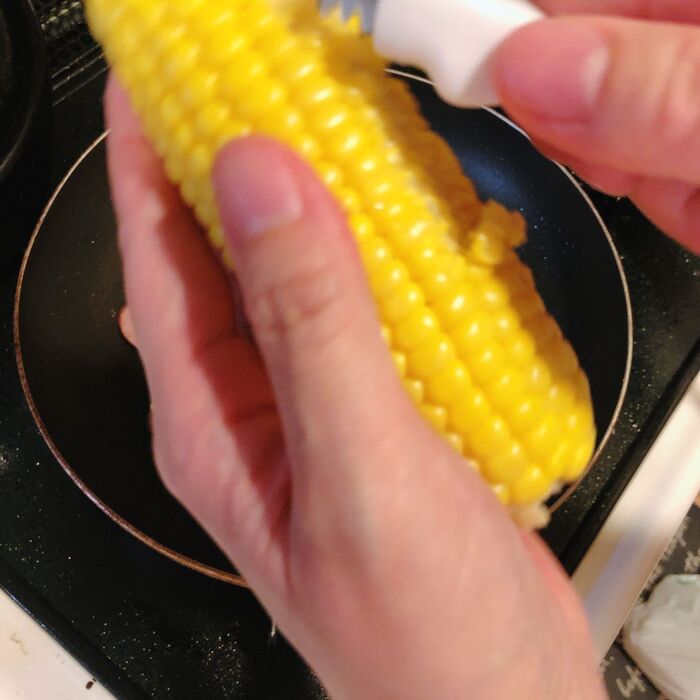 電子レンジでチンしたとうもろこしをほうれん草と一緒に炒めようとして、フライパンの上で使ってみたら…