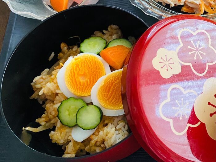 器に、⑤の混ぜご飯、その上に、ゆで卵のスライス、