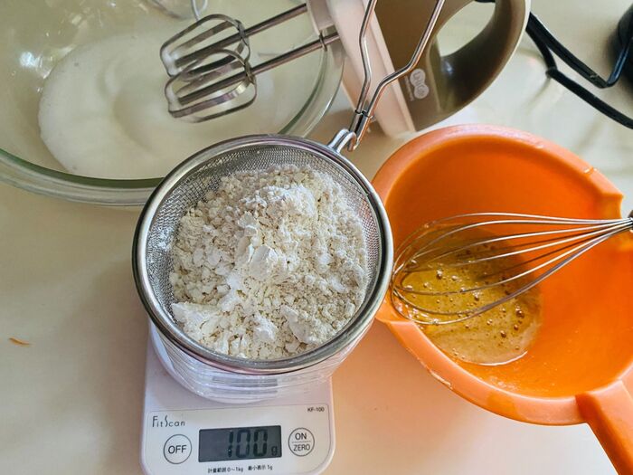 そこに、薄力粉、ベーキングパウダーをふるいながら入れます。
