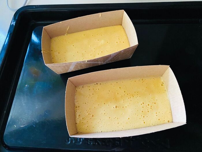 ⑥天板にパウンドケーキの型を置きます。そこに⑤の生地を入れます。