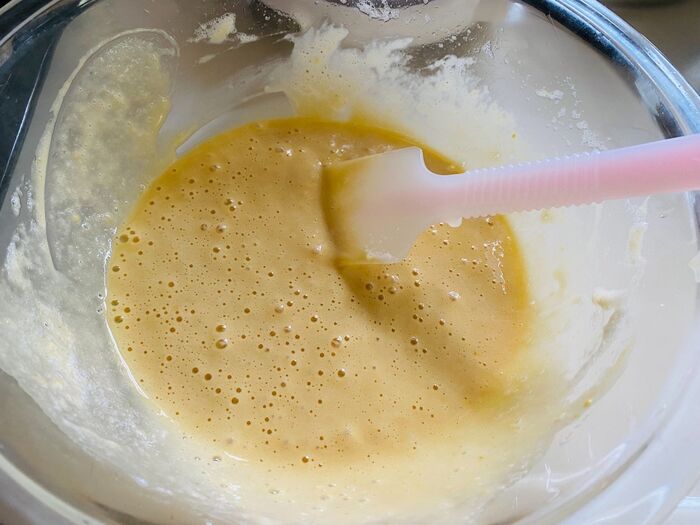 よく混ぜ混ぜ、最後に②を入れてさっくり混ぜます。