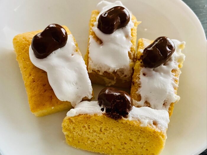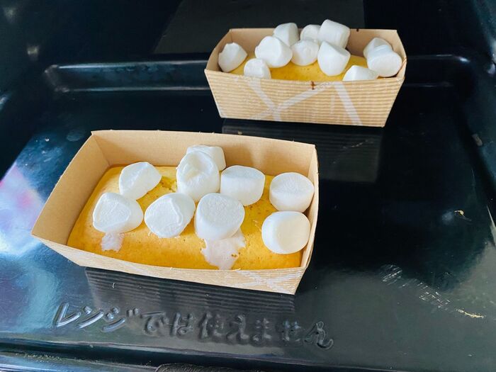 ⑦焼き上がりましたたら、④のマシュマロをのせ、オーブンに入れ余熱で溶かします。