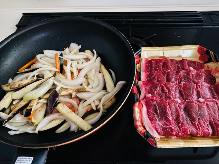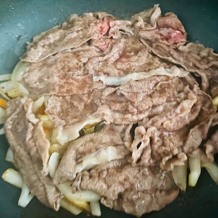 野菜が柔らかくなりましたら牛肉を開いてのせ、蓋をしてサッと蒸します。