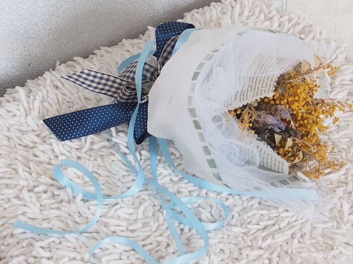 ・英字新聞とトレーニングペーパーの間にチュールを挟んだのは、面白いかもしれません。