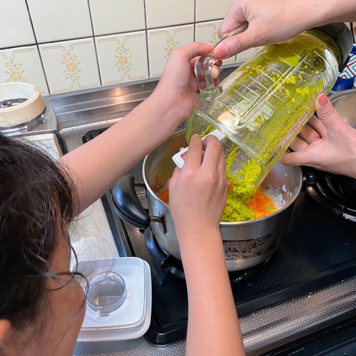 ミキサーにかけた野菜をヘラを使ってお鍋に。