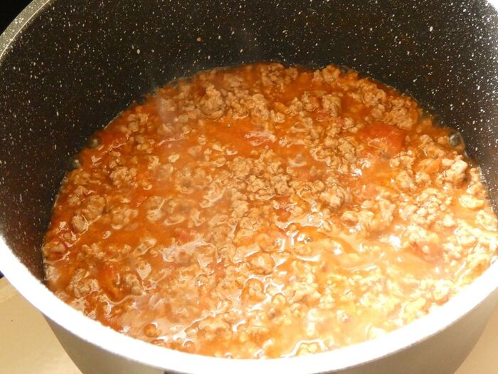 色が変わってきたら玉葱を入れてさっと炒め、トマト缶と塩こしょうを入れます。