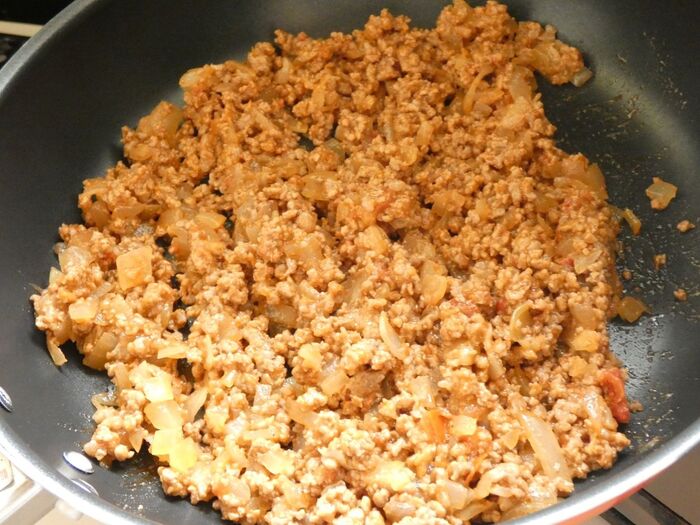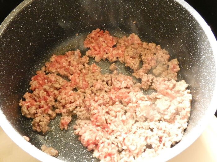 玉葱はみじん切りにします。フライパンに油とひき肉を入れて炒めます。
