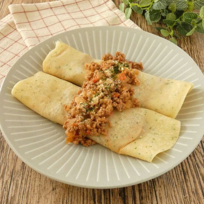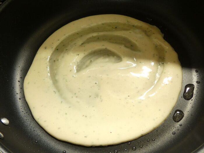 フライパンに油(分量外)をひいて生地を入れ、薄く焼きます。