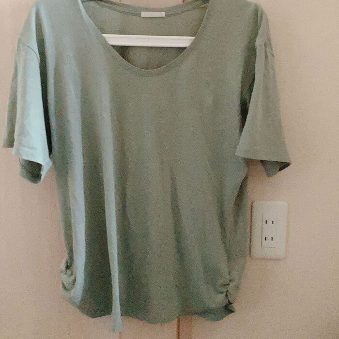 服を裏側から摘んで安全ピンで止めて、シンプルすぎるシルエットに動きを出すのが今回ご紹介する着痩せテクニックです。