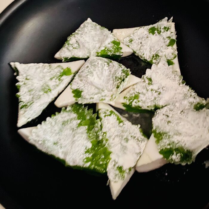 はんぺんを三角形にすると、大葉が巻きやすいです。