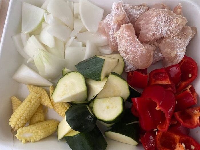 鶏むね肉は 食べやすい大きさに切り醤油・日本酒をふりよく揉み込んでから片栗粉をまぶし ズッキーニ 赤ピーマンは乱切り ヤングコーンは2〜3等分 玉ねぎは食べやすい大きさに切る