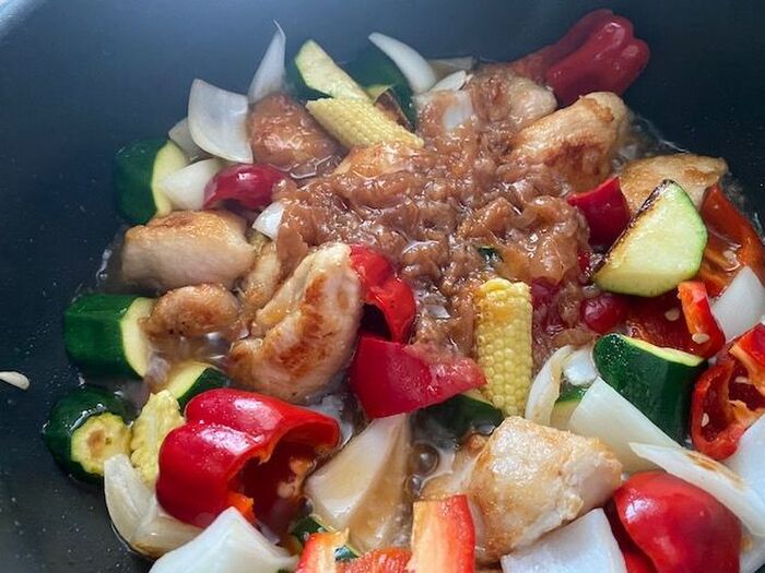 野菜に火が通ったら②の梅干しのタレを一気に加え全体に味を絡め 片栗粉・ごま油・