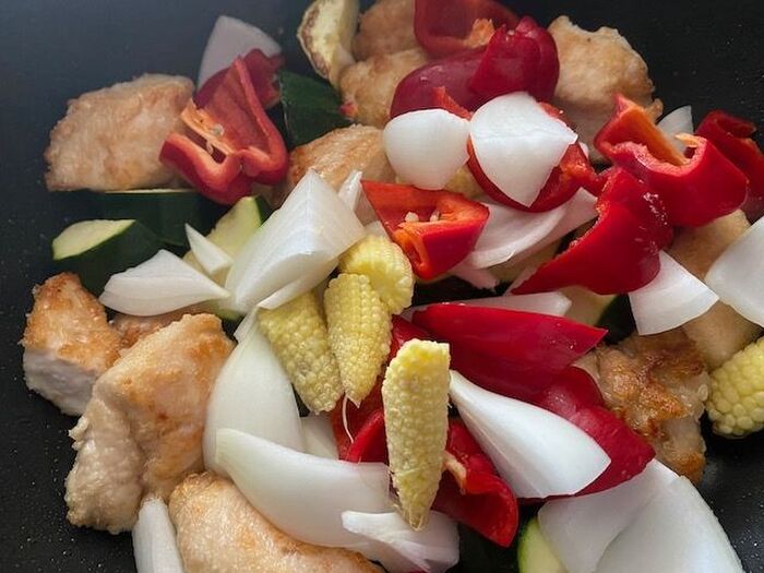 フライパンにオイルを入れ鶏むね肉をズッキーニ ヤングコーン 玉ねぎ 赤ピーマンを加え炒める