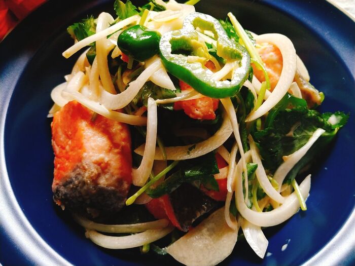 6.ボウルやバットに2の野菜の半量を敷き、上に鮭をのせ残りの