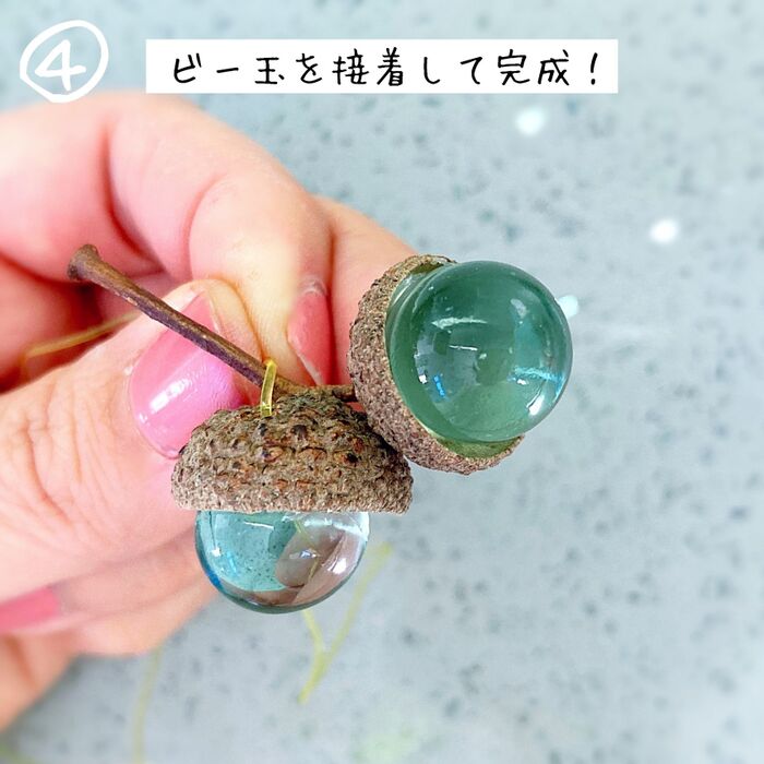 ④ グルーが固まる前に手早くビー玉を接着して完成!
