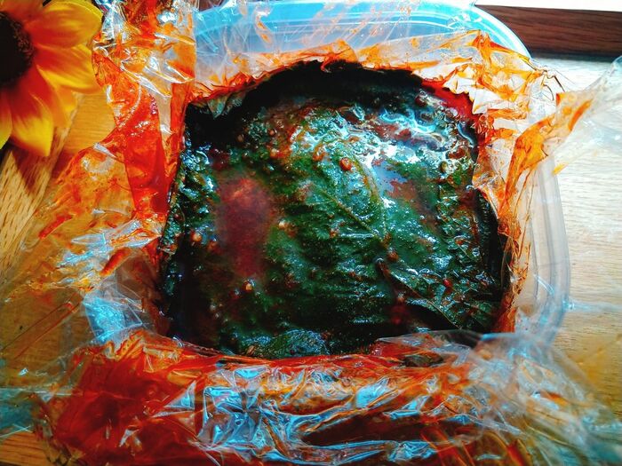4.えごま1枚づつ両面にAを押し当ててタッパーへ入れる。