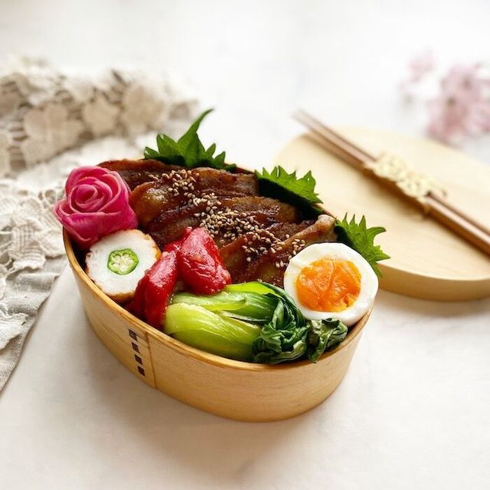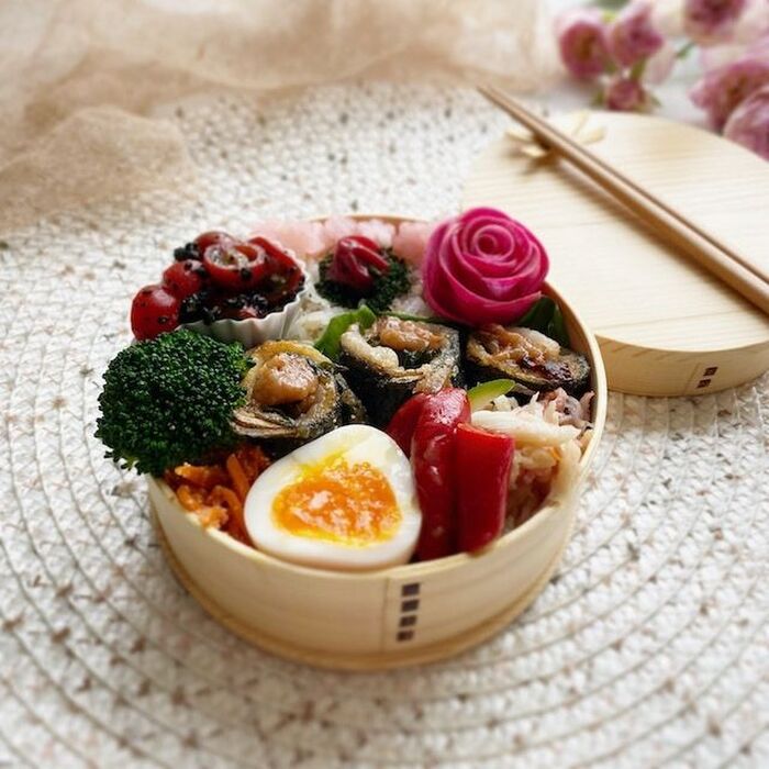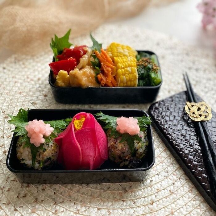 お弁当のすき間埋めおかずの紫大根を巻きつけたおにぎり