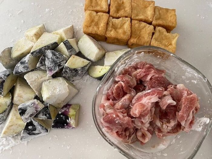なすは乱切りにして片栗粉半量をふり厚揚げは8等分に切り 豚薄切り肉は