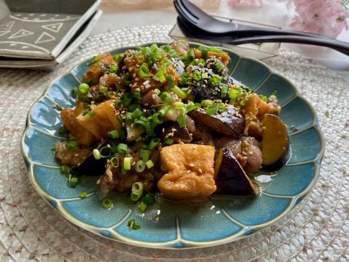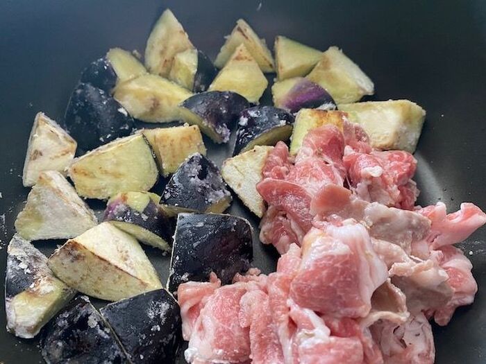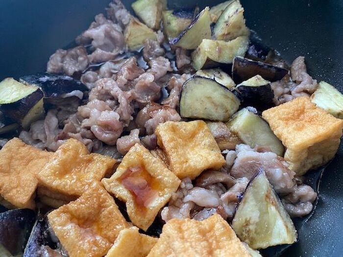 フライパンにオイルを入れなすを炒め 焼き色がついたら端に寄せ豚薄切り肉を加え炒め 色がほぼ変わってきたら厚揚げを加えて炒める