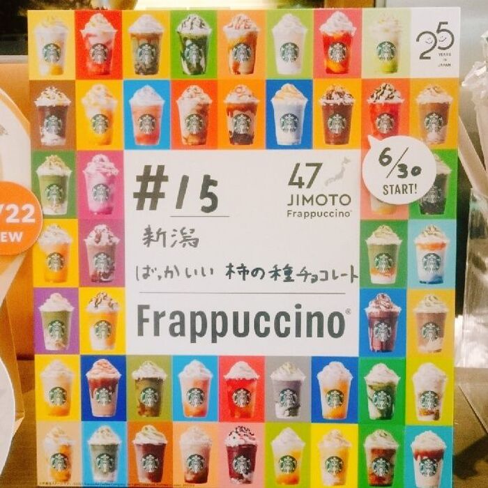 新潟県のフラペチーノは、チョコレートの味わいを存分に楽しめる、チョコレート風味のベースに、チョコレートチップや新潟を代表する柿の種を砕いて加えてあり、甘さと塩味のコンビネーション・カリっとした食感が楽しいフラペチーノになっています☆